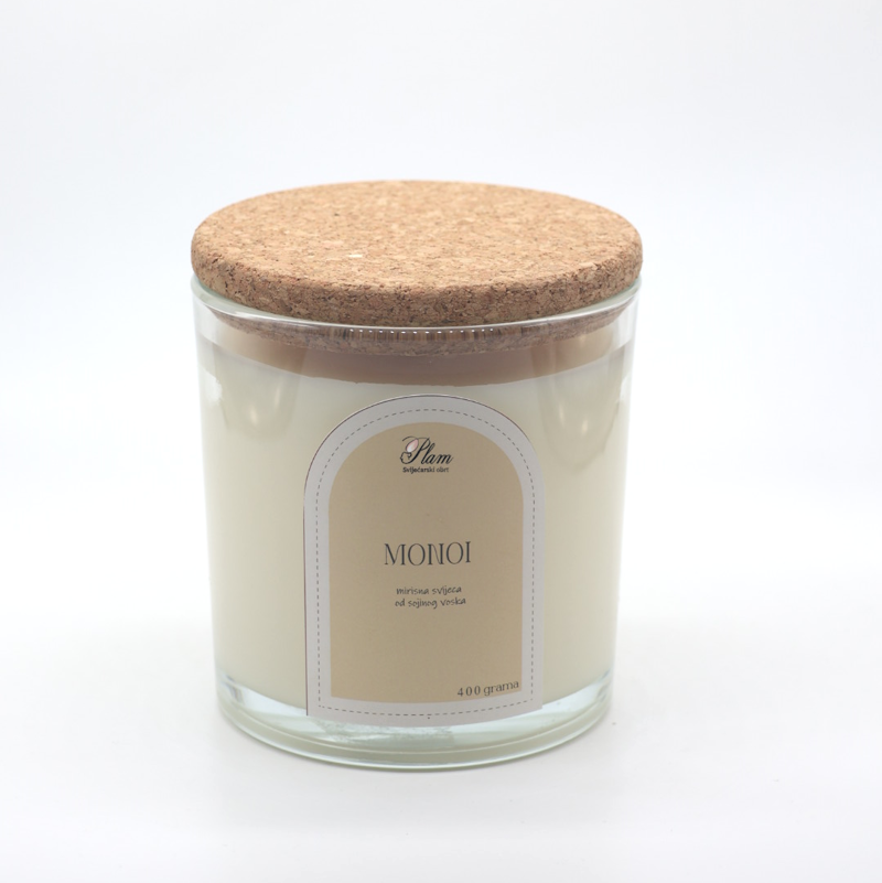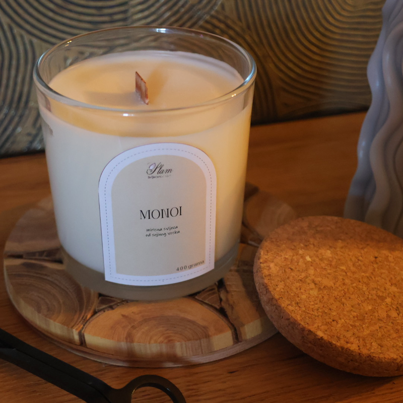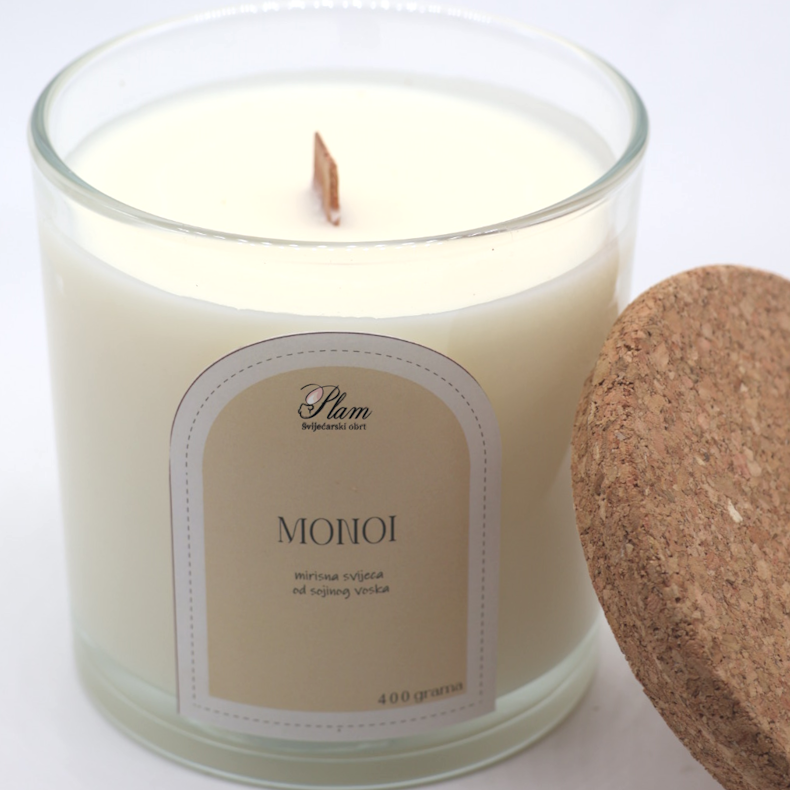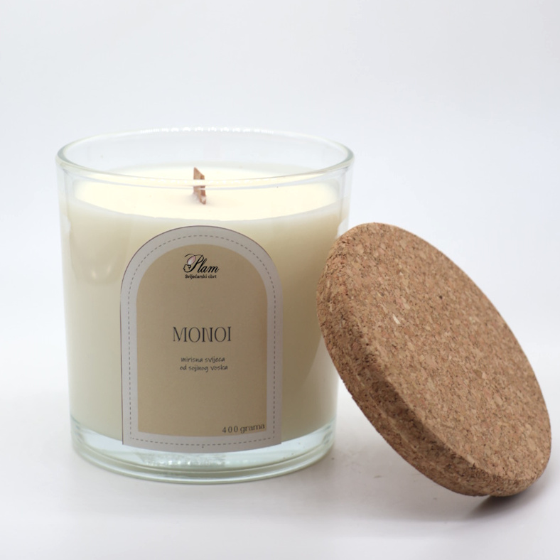 Ručno lijevana mirisna svijeća od sojinog voska s drvenim fitiljem u staklenci i s plutenim poklopcem.